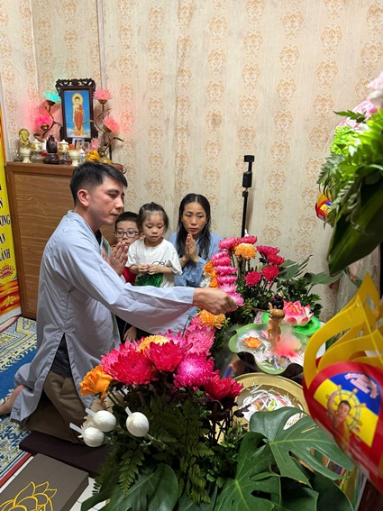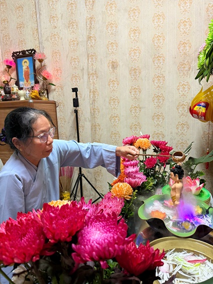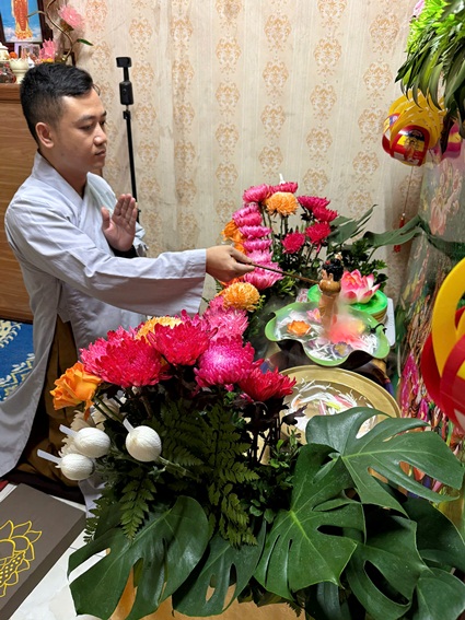 Hàng năm, khi tháng Tư về, dù ở bất cứ đâu, những người con Phật đều hân hoan kính mừng Phật đản. Đại lễ Phật đản là lễ hội truyền thống của Phật giáo, mang đậm giá trị văn hóa tâm linh từ ngàn đời xưa. Trong không khí hân hoan đón mừng ngày Đức Phật đản sanh PL. 2569 của hàng triệu người con Phật trên khắp năm châu. Với tấm lòng thành kính vô biên hướng về Đức Thế Tôn, những người con Phật bằng nhiều cách thức khác nhau, đã thể hiện sự tôn kính của mình đối với đấng Cha lành của nhân loại. Hòa chung trong tinh thần Nhà nhà mừng Phật đản - Người người mừng Phật đản và được sự hướng dẫn, chỉ dạy của Thượng toạ Bổn sư Thích Tâm Phương - Uỷ viên BTS GHPGVN tỉnh Tp. Huế - Trưởng BTS GHPGVN huyện A Lưới, Tối ngày 11/05/2025, tại tư gia Phật tử Quảng Hưng - Nguyễn Anh Đức (số nhà 214 đường Thăng Long, xóm 14, xã Nghi Kim, Tp. Vinh) đã tôn trí bồn Tắm Phật tại tư gia và trang nghiêm sâu lắng tổ chức Lễ Tắm Phật trong niệm thành kính.