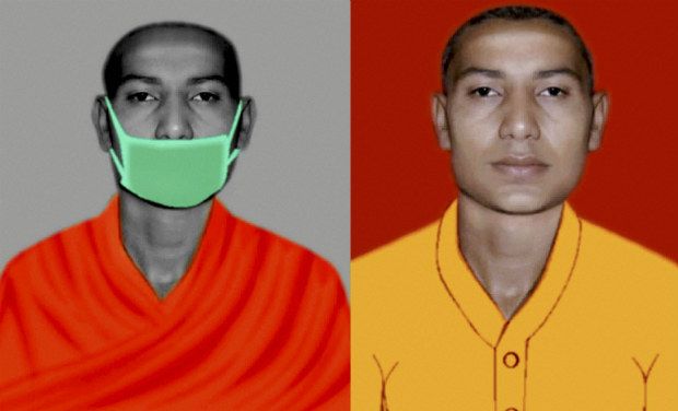 Hai bản phác thảo (có và không có mặt nạ) của nghi can, người mặc trang phục của một tu sĩ Phật giáo, đang được chia sẻ với công chúng để quảng bá rộng rãi và hỗ trợ trong việc điều tra.