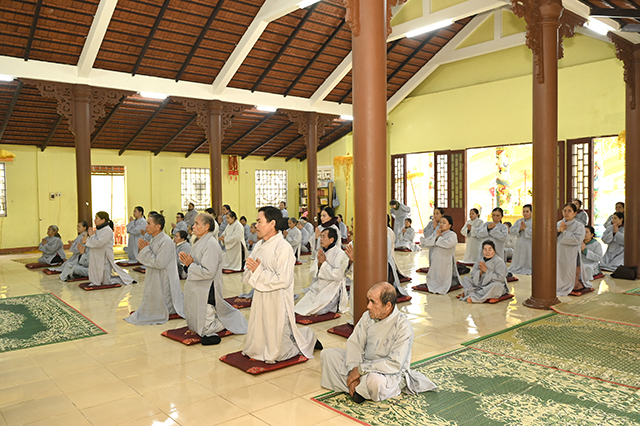 Khóa tu Bát Quan trai bắt đầu từ 7 giờ 30, từ sáng sớm, quý Đạo hữu vân tập đến Chánh điện, Ban Nghi lễ cử hành thời khóa sám hối lục căn cho được thanh tịnh, sau đó là truyền giới Bát Quan trai của Đại đức Thích Thiền Huy, Chánh thư ký Ban Trị sự GHPGVN huyện A Lưới.