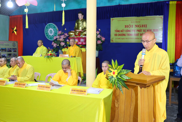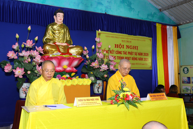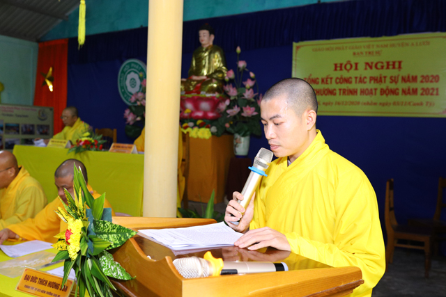 Đại đức Thích Hương Sơn, Chánh Thư ký Ban Trị sự GHPGVN huyện A Lưới đã đọc báo cáo tổng kết Phật sự năm 2020 và chương trình hoạt động Phật sự năm 2021 nổi bật là công tác từ thiện, an sinh xã hội trong năm nay. Tổng cộng: 24.087 phần quà, 10.000 chiếc khẩu trang, 05 tấn gạo, xây dựng 06 căn nhà tình thương, hỗ trợ tấm lợp 65 ngôi nhà bị tốc mái; Tổng trị giá: 9.224.800.000đ (Chín tỷ, hai trăm hai mươi bốn triệu, tám trăm ngàn đồng chẳn).