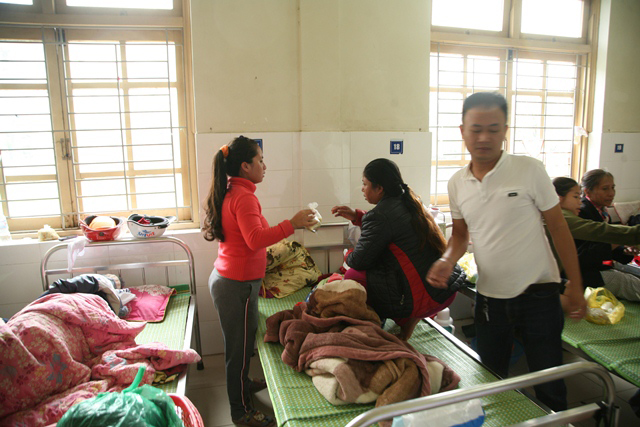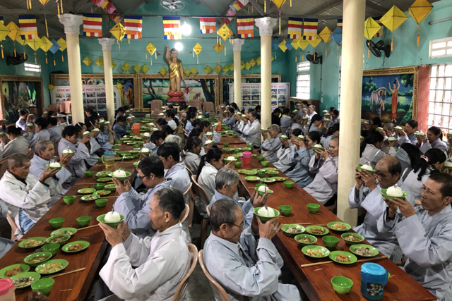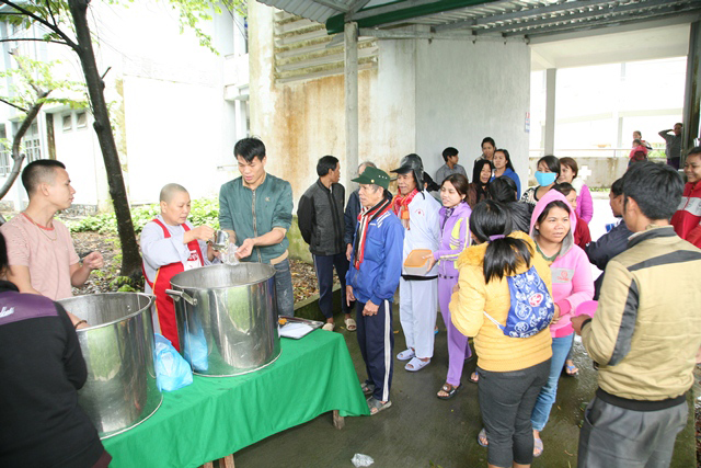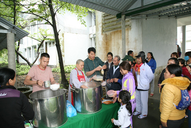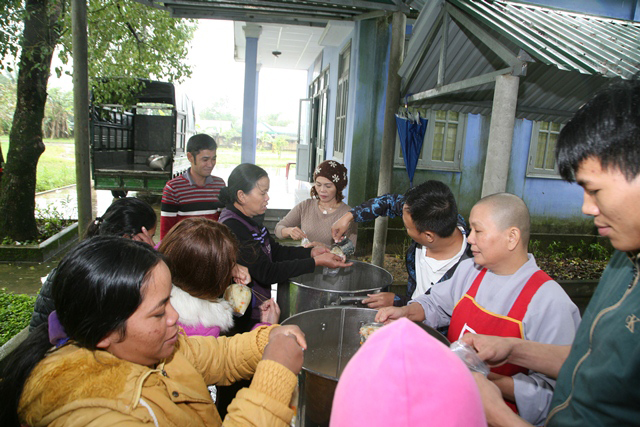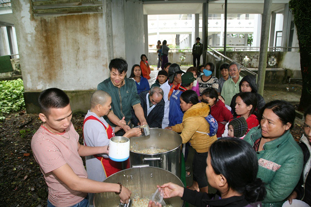 Buổi sáng cùng ngày, Sư cô Thích Nữ Diệu Trung, Phó Trưởng Ban Trị sự, Trưởng Ban Từ thiện xã hội cùng các Phật tử đã phát cháo định kỳ đến các bệnh nhân đang điều trị tại bệnh viên huyện A Lưới.