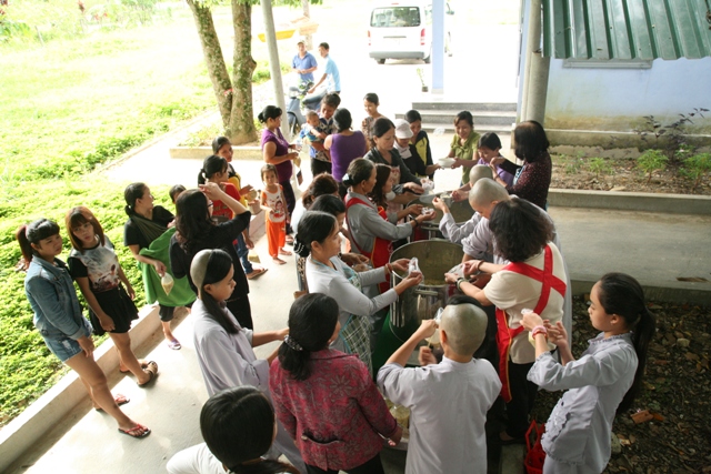 Buổi sáng cùng ngày, chư Tôn đức đã phát gạo đến các hộ nghèo và phát cháo tại bệnh viện huyện A Lưới đến bệnh nhân và người nhà đang điều trị tại trung tâm y tế huyện.