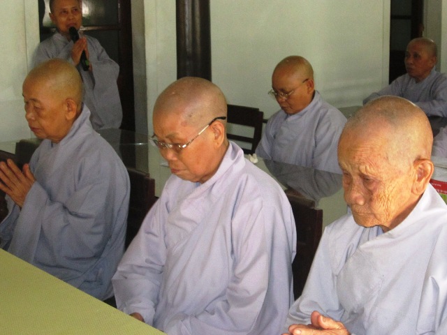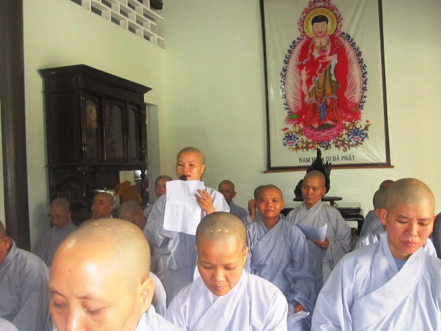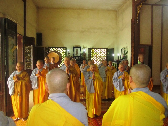 Tiếp đến, chư Tôn đức Ni đã trang nghiêm vân tập tại Trai đường để thực hiện nghi thức Quá đường dưới sự chủ trì của Ni trưởng Thích Nữ Chơn Viên. Sau đó, toàn thể đại chúng đã niệm Phật kinh hành quanh Bảo điện và cầu nguyện hồi hướng.