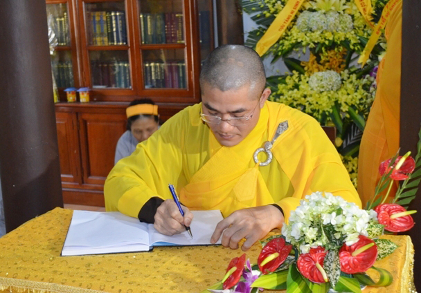 Đại đức Thích Tâm Phương thay mặt Ban Trị sự ghi vào sổ tang lưu niệm