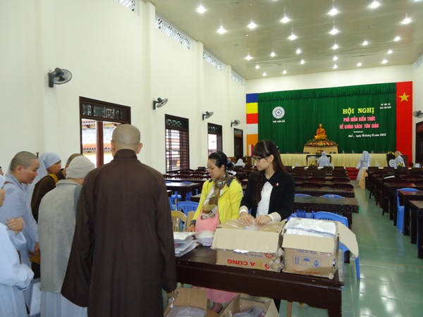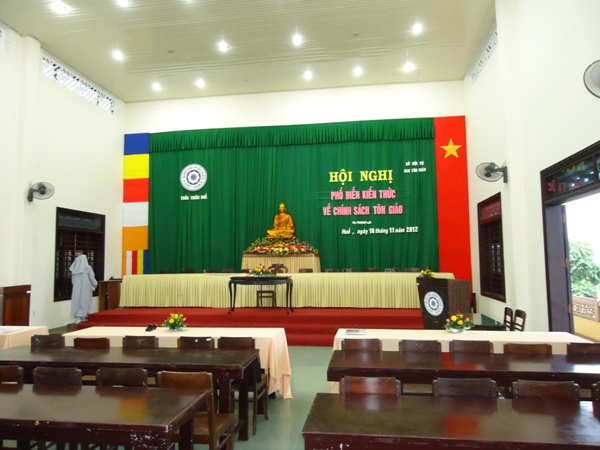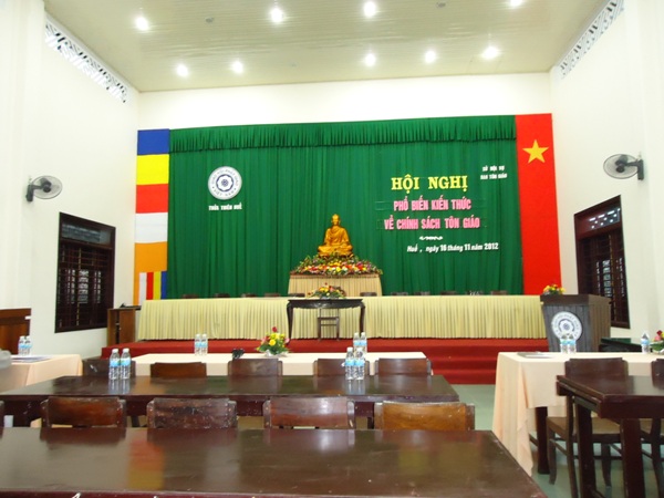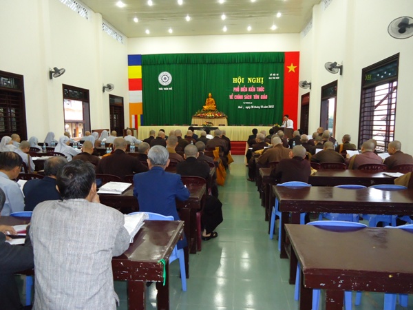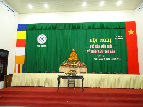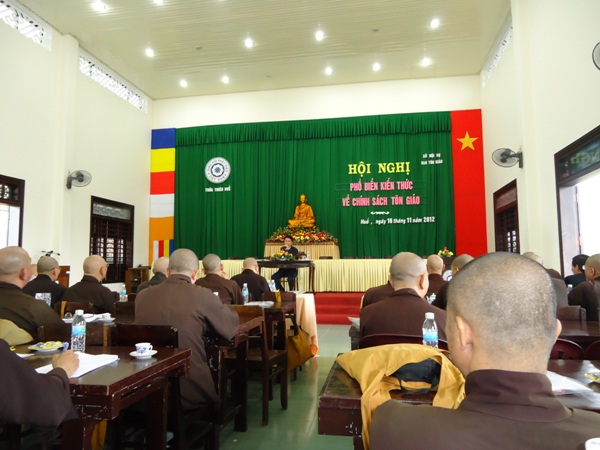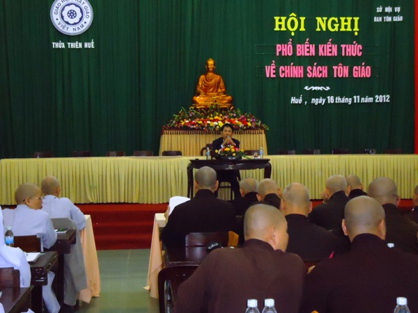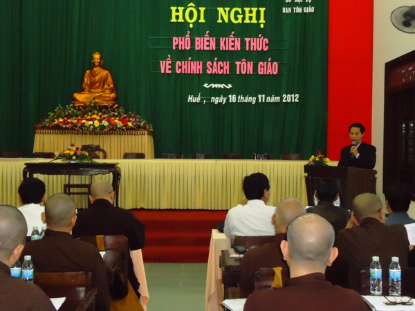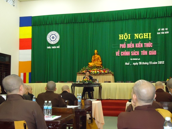Sáng nay, ngày 16.11.2012 tại Hội trường Ban Trị sự tỉnh GHPG Thừa Thiên Huế, số 01, Sư Liễu Quán, phường Trường An, thành phố Huế. Ban Trị sự phối hợp với Ban Tôn giáo tỉnh Thừa Thiên Huế đã tổ chức Hội nghị phổ biến kiến thức về chính sách, pháp luật tôn giáo, nhằm phổ biến chủ trương, chính sách về tôn giáo của Đảng và Nhà nước trong giai đoạn hội nhập và phát triển đến Chư Tôn đức Tăng Ni và cư sĩ Phật tử trong tỉnh Thừa Thiên Huế.