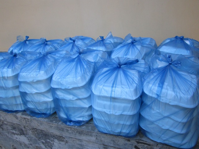 mỗi phần cơm của sĩ tử gồm Hộp cơm, bịch sửa và chai nước suối