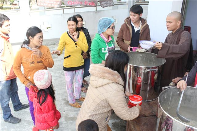 7 giờ, phái đoàn có mặt tại Niệm Phật đường Sơn Thủy, quý Sư cô tất bật lo nấu cháo để phát tại bệnh viện huyện A Lưới.