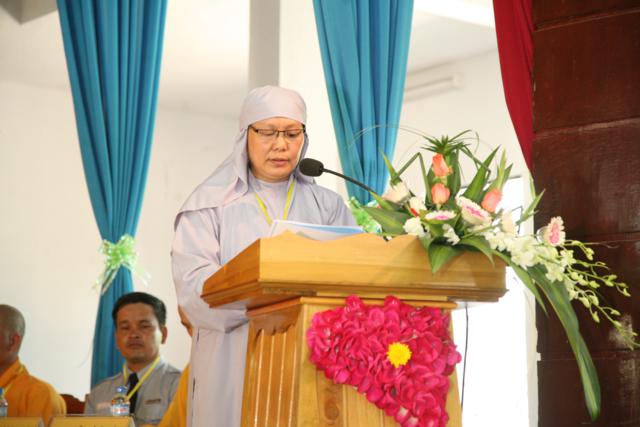Sư cô Thích Nữ Diệu Trung, Phó Trưởng BTS, Trưởng Ban TTXH trình bày tham luận