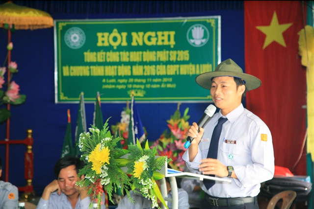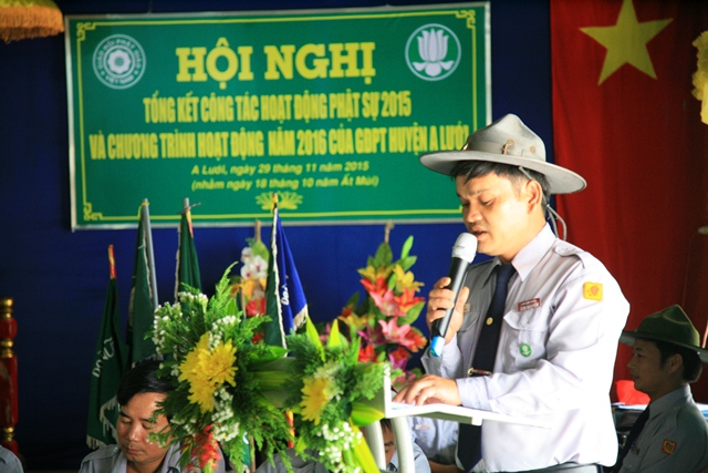 Huynh trưởng cấp Tín: Quảng Thông - Lê Văn Hoàng, Liên đoàn trưởng GĐPT Sơn Nguyên đọc báo cáo Tổng kết công tác hoạt động Phật sự năm 2015 của GĐPT huyện A Lưới. "Được sự chỉ đạo sâu sát của Thường trực Ban Trị sự GHPGVN huyện A Lưới, sự quan tâm ưu ái, của Ban Hướng dẫn Phân ban GĐPT tỉnh; bằng tất cả tấm lòng phụng sự của các Huynh trưởng cũng như tinh thần đoàn kết hòa hợp nội bộ tạo sự đồng thuận của cộng đồng xã hội trong chiều hướng hội nhập và phát triển tại huyện nhà nên đã đạt những thành quả nhất định.