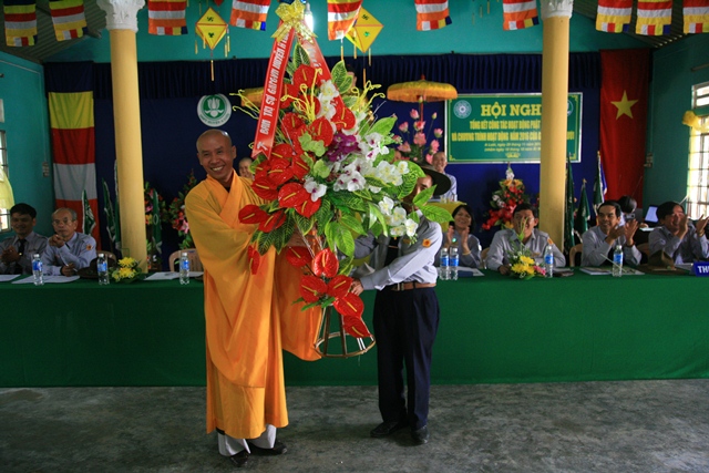 Đại đức Thích Tín Nhơn, Phó Trưởng Ban Thường trực Ban Trị sự GHPGVN huyện A Lưới thay mặt chư Tôn đức Thường trực Ban Trị sự tặng hoa chúc mừng Hội nghị.