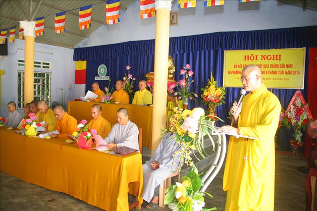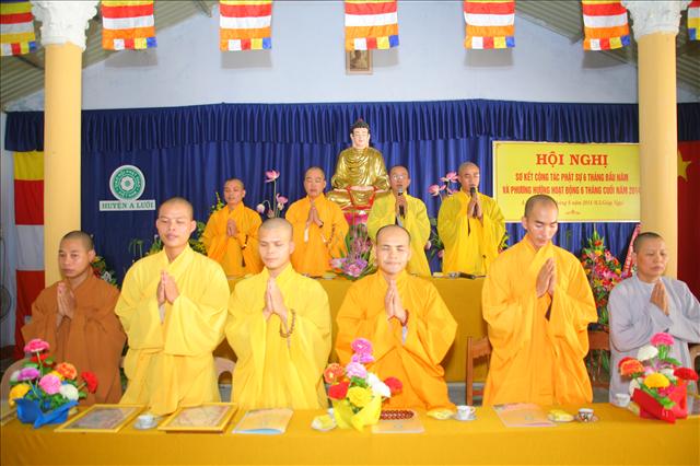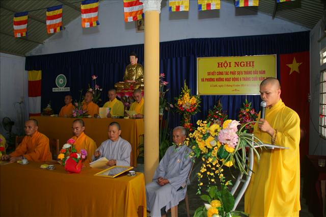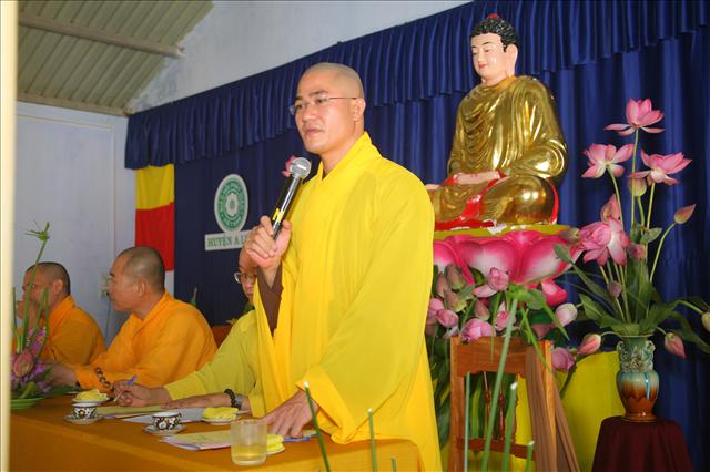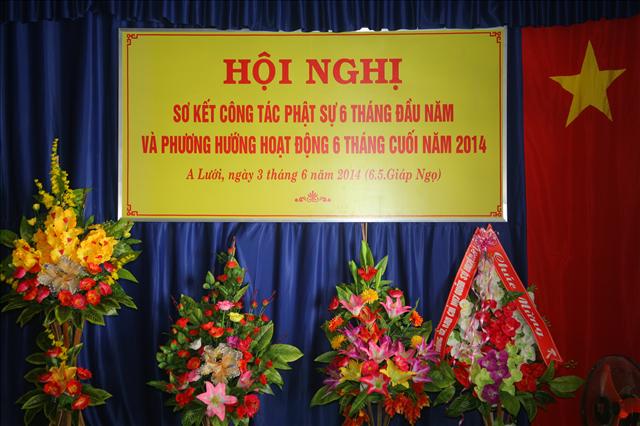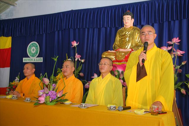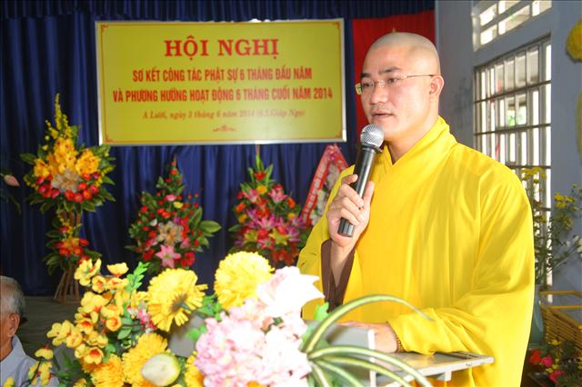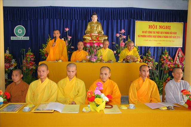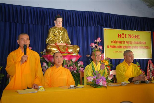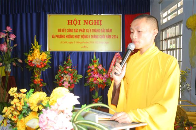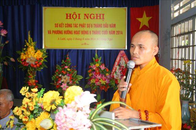 Đại đức Thích Chánh Đức đọc báo cáo Sơ kết công tác Phật sự 6 tháng đầu năm và chương trình hoạt động 6 tháng cuối năm 2014. “Trong 6 tháng qua, Ban Trị sự huyện đã có những thành tựu nhất định về mọi hoạt động Phật sự của các ban ngành, nổi bật là Tuần lễ Phật đản (vesak) PL.2558 và công tác từ thiện xã hội, trong 6 tháng qua Ban Từ thiện xã hội GHPGVN huyện A Lưới đã tích cực vận động các nhà hảo tâm cũng như quý Phật tử ở trong và ngoài nước, được sự giúp đỡ tạo điều kiện thuận tiện của chính quyền địa phương, nhất là các xã biên giới, đồn biên phòng đã thực hiện hơn 11 đợt từ thiện đồng thời giúp đỡ bà con dân tộc thiểu số và các gia đình Đạo hữu có hoàn cảnh khó khăn; thăm tặng quà ở Trung tâm Y tế, Hội người mù, Thực hiện Nồi cháo An lạc dinh dưỡng định kỳ 2 lần/1 tháng đến bệnh nhân và người nhà tại bệnh viện huyện A Lưới. Tổng cộng trên 1.650 phần quà, khám chữa bệnh và phát thuốc miễn phí hơn 300 bệnh nhân, xây dựng 2 căn nhà tình thương; tổng trị giá 482.000.000đ (Bốn trăm tám mươi hai triệu đồng chẵn).