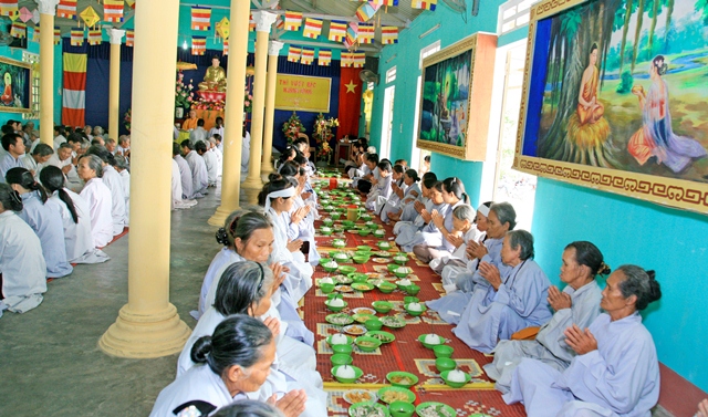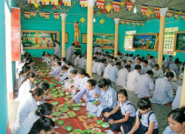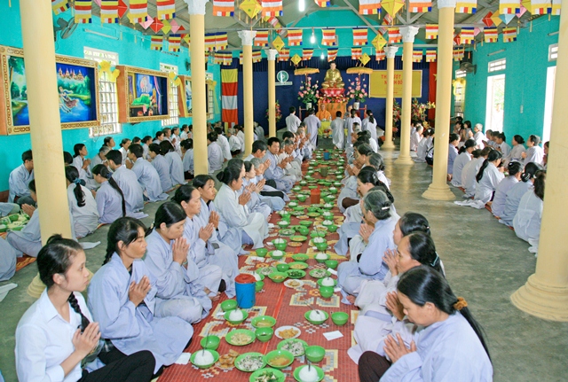 Sau khi thuyết giảng, Đại đức Thích Tâm Phương và Sư cô Thích Nữ Diệu Trung đã hướng dẫn Đạo hữu Phật tử nghi thức Quá đường và dùng cơm trong chánh niệm. Đặc biệt, nhân mùa An cư kiết hạ PL 2559, Đạo tràng Pháp hoa Hương Đàm và gia đình Phật tử Nguyễn Thị Thu tại thành phố Huế đã phát tâm cúng dường tịnh tài, tịnh vật lên hiện tiền chư Tôn đức và Đạo tràng Phật tử ngõ hầu đền đáp công ơn sâu nặng của cha mẹ hiện tiền cũng như quá vãng.