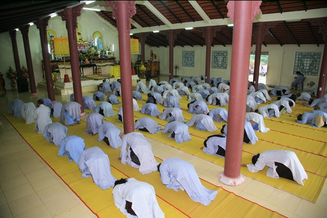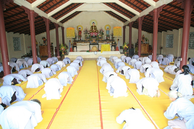Mở đầu khóa tu, quý Đạo hữu Ban Nghi lễ Niệm Phật đường Sơn Thủy hướng dẫn đại chúng cử hành thời khóa sám hối, quý Đạo hữu trang nghiêm thành kính ngũ phục đầu địa sám hối tam nghiệp cho thanh tịnh.