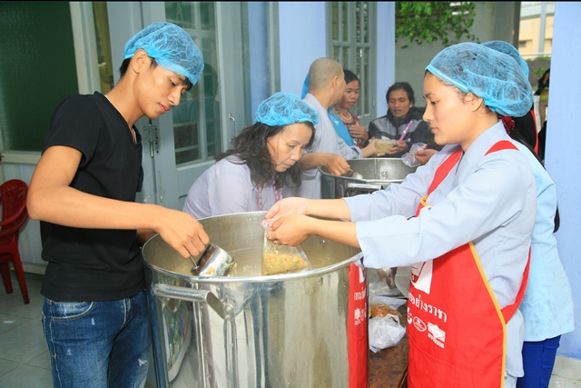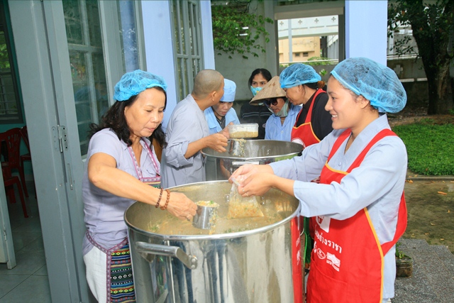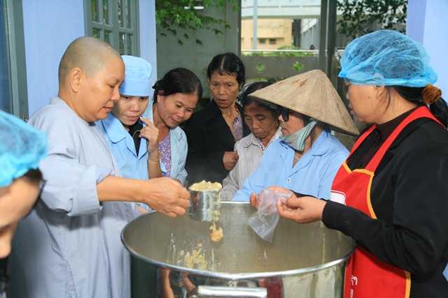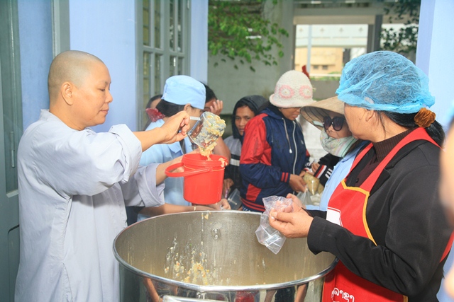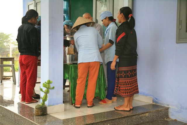 Trước đó, Sư cô Thích Nữ Diệu Trung, Phó Trưởng Ban Trị sự, Trưởng Ban TTXH và quý Đạo hữu đã phát cháo định kỳ đến bà con bệnh nhân đồng bào khó khăn tại bệnh viện huyện A Lưới