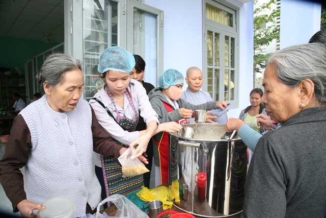 Buổi sáng cùng ngày, Sư cô Thích Nữ Diệu Trung, Phó Trưởng Ban Trị sự, Trưởng Ban TTXH GHPGVN huyện A Lưới cùng quý Đạo hữu tại thành phố Huế về tại Bệnh viện huyện A Lưới để phát cháo dinh dưỡng đến các bệnh nhân và người nhà đang điều trị tại Trung tâm y tế huyện.