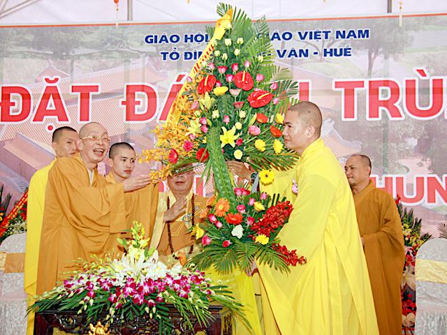 Sau phần diễn văn lễ đặt đá, Hòa thượng đương kim trú trì Tổ đình Tường Vân đã đón nhận những lẵng hao tươi thắm của Trưởng lão Hòa thượng Thích Đức Phương, HĐCM, HĐTS, VP1, VP2 TƯ GH, các ban viện, Lãnh đạo Đảng, Chính quyền, Mặt trận trung ương của như tỉnh Thừa Thiên Huế.
