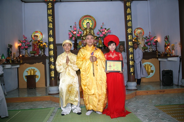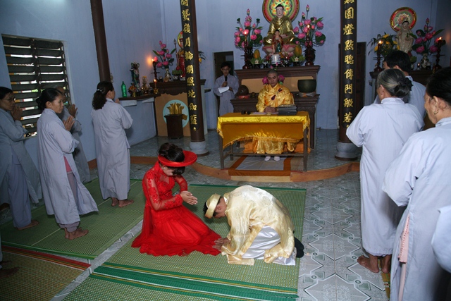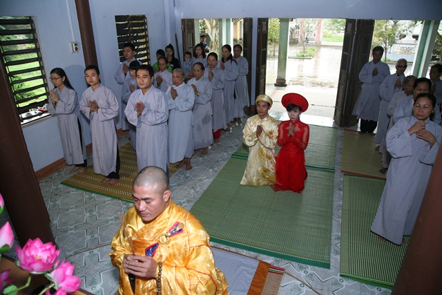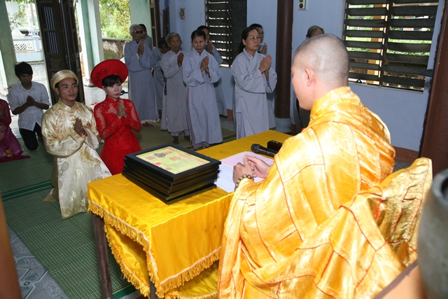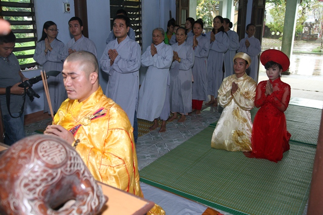 Phát nguyện tại buổi lễ, đôi Tân lang tân nương phát nguyện. “Đứng truớc Tam bảo cùng hiện tiền chư Tôn đức cũng như bà con Phật tử, hai chúng con xin thành tâm phát nguyện: Dẫu cuộc đời có gặp khó khăn thử thách chúng con cũng đồng lòng đồng ưu cộng lạc, trên thuận dưới hòa sống trọn đạo làm con và bổn phận của nguời con Phật. Chúng con luôn tôn trọng nhau, thành thật và thủy chung trọn đời, để khỏi phụ lòng ơn sanh thành giáo duỡng và niềm tin yêu của cha mẹ cũng như tỏ lòng tri ân đến Tam Bảo và chư Tôn đức, chúng con nguyện phụng đạo giúp đời, làm nguời tốt trong xã hội”.