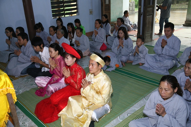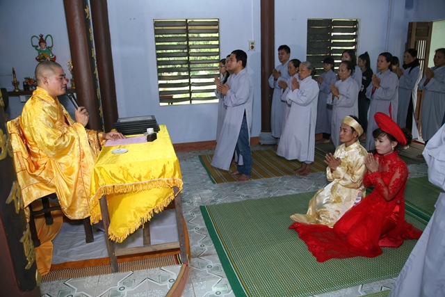 Tại buổi lễ đôi tân lang tân nương được lắng nghe Đại đức truyền thọ Tam quy Ngũ giới và giảng giải về đạo nghĩa vợ chồng, khuyến tấn đôi bạn phải sống trọn vẹn bổn phận làm vợ, làm chồng, làm dâu thảo, rể hiền cùng nhau xây dựng hạnh phúc gia đình, đối trước Tam bảo, đôi bạn trẻ phát nguyện sống chung hạnh phúc theo 5 nguyên tắc đạo đức cơ bản của Phật giáo, lấy giáo lý Phật Đà làm kim chỉ nam cho cuộc sống hiện tại.