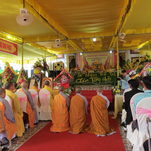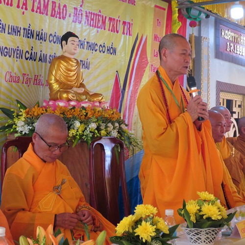 Ban đạo từ tại buổi lễ, HT. Thích Hải Ấn, UVTT HĐTS GHPGVN, Giáo phẩm Chứng minh BTS GHPGVN tỉnh TT. Huế, Viện trưởng Học viện Phật giáo Việt Nam tại Huế đã tán thán đạo tâm, công đức của Ban Hộ tự cùng toàn thể Đạo hữu Phật tử gần xa đã đóng góp người công kẻ của xây dựng ngôi Chánh điện thập phần viên mãn. Đồng thời, nhân lễ bổ nhiệm trú trì, Hòa thượng mong muốn rằng Sư cô Thích Nữ Hoàn Thục cố gắng hoàn thành tốt các công tác Phật sự tại địa phương theo hiến chương của Giáo hội và pháp luật của nhà nươc, xứng đáng với vai trò của vị trú trì trên con đường phụng sự đạo pháp, làm tròn nhiệm vụ của một sứ giả Như Lai, cố gắng phát huy tinh thần đoàn kết, hòa hợp, cùng với Ban Hộ tự và quý Phật tử địa phương xây dựng ngôi chùa Tây Hải ngày càng vững mạnh.