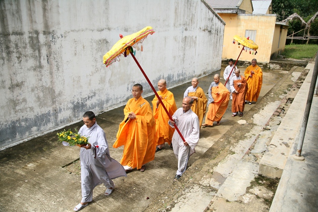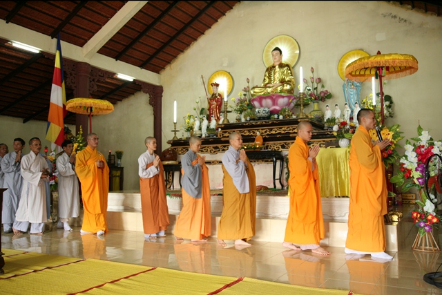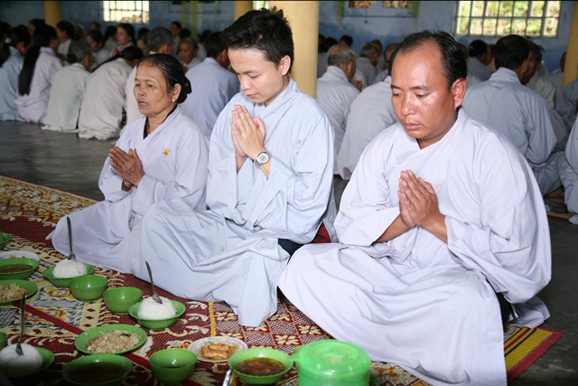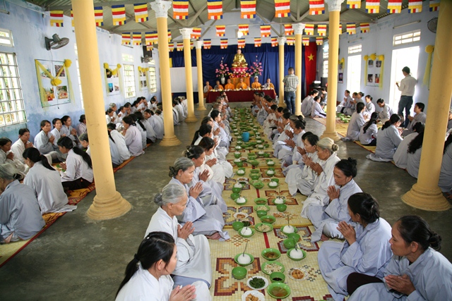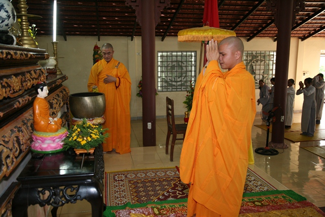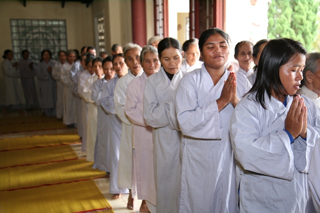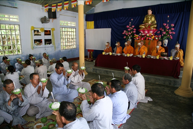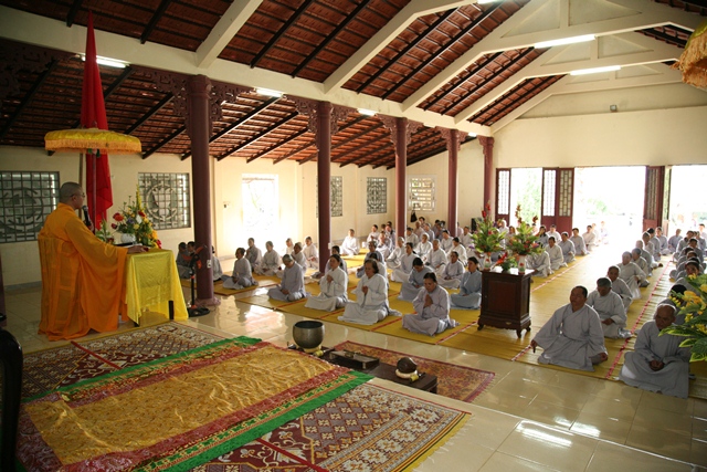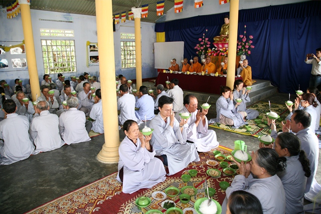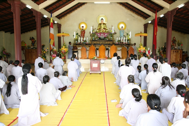 Đúng 7 giờ 30 phút, quý Phật tử vân tập cử hành nghi thức sám hối, toàn thể đạo tràng trang nghiêm phủ phục 5 vóc sát đất, sám hối tam nghiệp của mình cho được thanh tịnh để lắng nghe giới pháp.