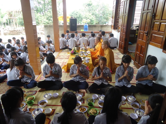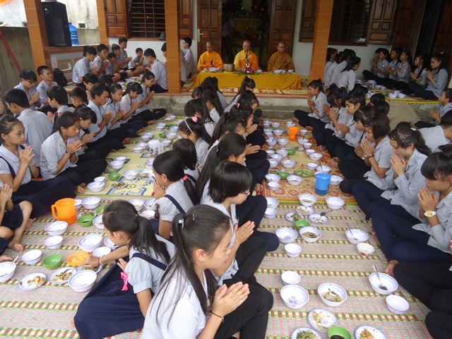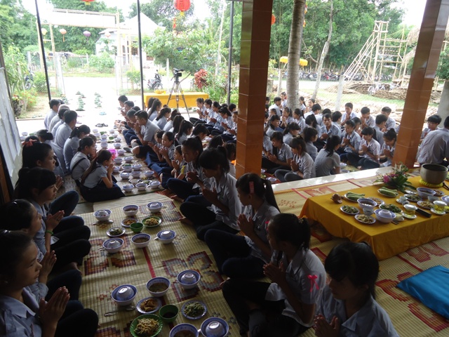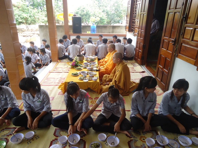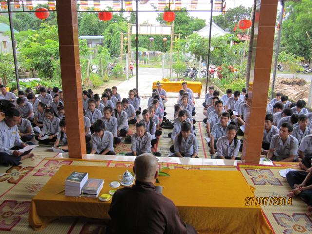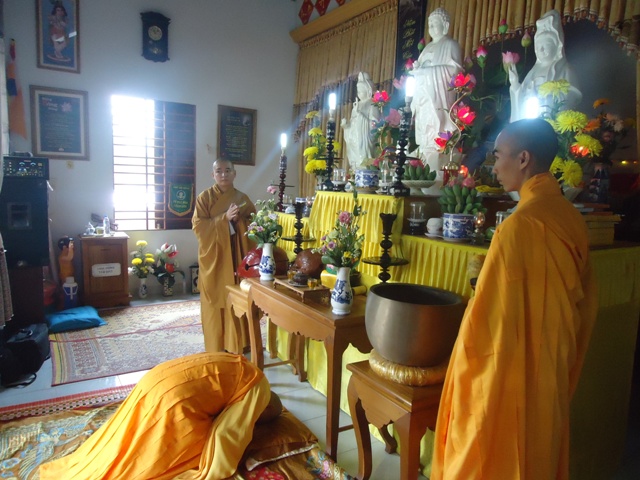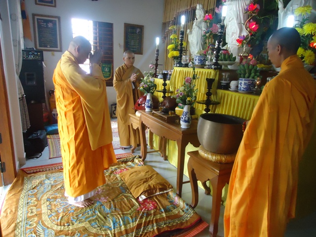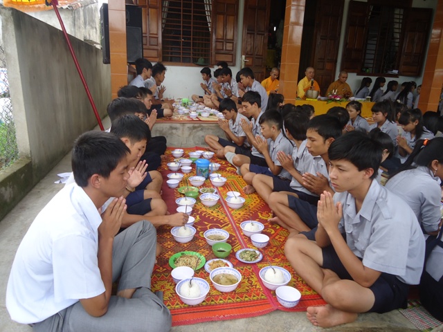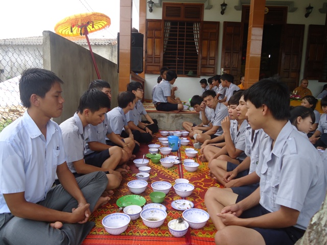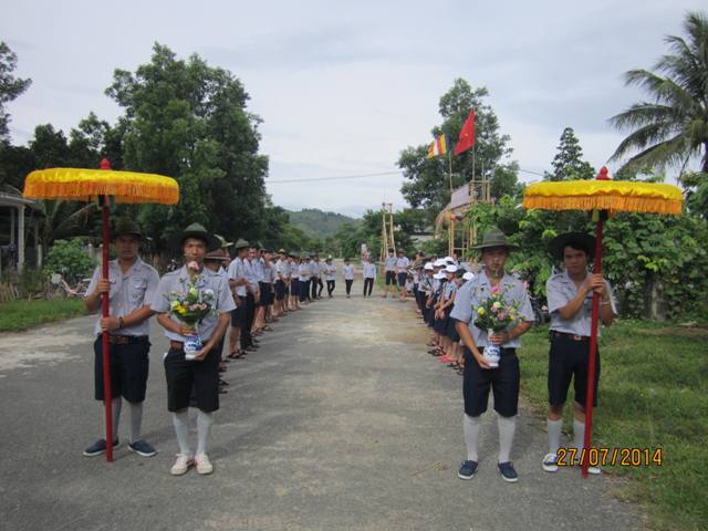 Sau hơn 1giờ đồng hồ thuyết giảng. Thượng tọa cùng chư Tăng hướng dẫn nghi thức Quá đường cho quý bác trong Ban Hộ tự Niệm Phật đường Sơn Nguyên và toàn thể Huynh trưởng và đoàn sinh trong GĐPT huyện A Lưới.