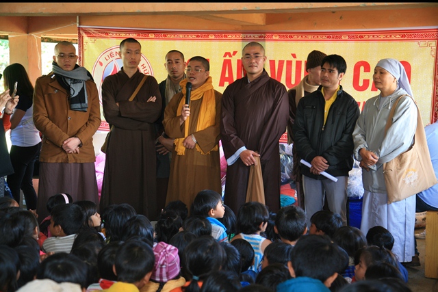 Đại đức Thích Tâm Phương thay mặt Ban Trị sự và bà con được giúp đỡ phát biểu cảm ơn đến Đại đức cùng phái đoàn Liên sanh hữu hội đã trao những tặng phẩm ý nghĩa đến với bà con và học sinh có hoàn cảnh khó khăn tại xã Đông Sơn.