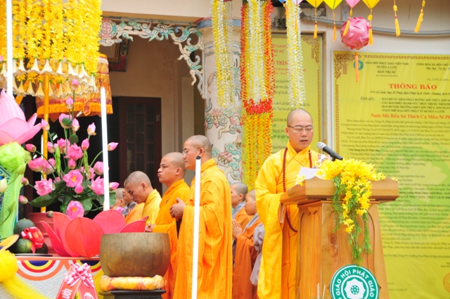Đại đức Thích Tâm Phương, Trưởng BTS - Trưởng BTC đã tuyên đọc diễn văn Đại lễ của Hòa thượng Chủ tịch HĐTS GHPGVN. "Sự kiện Đức Phật đản sinh là bức thông điệp hòa bình, hạnh phúc thương yêu, mở ra con đường mà tự thân mỗi người phải vượt qua sự cám dỗ và chi phối của tham ái để tiến đến cảnh giới giác ngộ, đó chính là con đường tu tập Giới - Định -Tuệ hướng đến sự an lạc, giải thoát là lẽ đích thực và cứu cánh của cuộc sống và cuộc đời hướng thượng. Hôm nay Tăng Ni, Phật tử Phật giáo Việt Nam long trọng tổ chức Đại lễ kỷ niệm ngày Đức Phật đản sinh PL.2560 – DL.2016 trong niềm hoan hỷ vô biên hướng tới kỷ niệm 35 năm ngày thành lập Giáo hội Phật giáo Việt Nam (1981 – 2016), đặc biệt là cùng với nhân dân đồng bào cả nước tích cực tham gia vào kỳ bầu cử Quốc hội khóa XIV và Hội đồng nhân dân các cấp nhiệm kỳ 2016 – 2021 thành công rực rỡ".