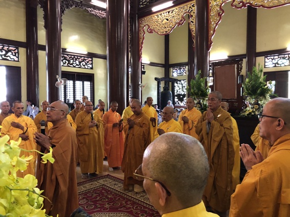 Phái đoàn HĐTS do HT.Thích Thiện Pháp, Phó Chủ tịch Thường trực HĐTS làm trưởng đoàn dâng hương tưởng niệm và đảnh lễ Giác linh Trưởng lão HT.Thích Minh Châu chiều 26-8.