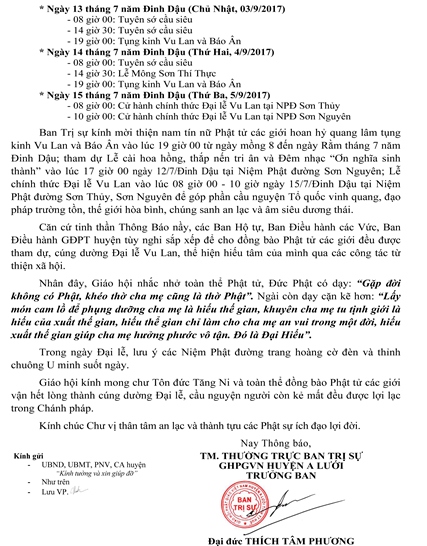 Ban Trị sự kính mời thiện nam tín nữ Phật tử các giới hoan hỷ quang lâm tụng kinh Vu Lan và Báo Ân vào lúc 19 giờ 00 từ ngày mồng 8 đến ngày Rằm tháng 7 năm Đinh Dậu; tham dự Lễ cài hoa hồng, thắp nến tri ân và Đêm nhạc “Ơn nghĩa sinh thành” vào lúc 17 giờ 00 ngày 12/7/Đinh Dậu tại Niệm Phật đường Sơn Nguyên; Lễ chính thức Đại lễ Vu Lan vào lúc 08 giờ 00 - 10 giờ ngày 15/7/Đinh Dậu tại Niệm Phật đường Sơn Thủy, Sơn Nguyên để góp phần cầu nguyện Tổ quốc vinh quang, đạo pháp trường tồn, thế giới hòa bình, chúng sanh an lạc và âm siêu dương thái.