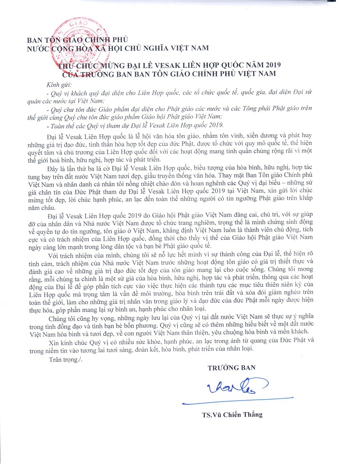 Đây là lần thứ ba lá cờ Đại lễ Vesak Liên hợp quốc, biểu tượng của hòa bình, hữu nghị, hợp tác tung bay trên đất nước Việt Nam tươi đẹp, giầu truyền thống văn hóa. Thay mặt Ban Tôn giáo Chính phủ Việt Nam và nhân danh cá nhân tôi nồng nhiệt chào đón và hoan nghênh các Quý vị đại biểu – những sứ giả chân tín của Đức Phật tham dự Đại lễ Vesak Liên hợp quốc 2019 tại Việt Nam, xin gửi lời chúc mừng tốt đẹp, lời chúc hạnh phúc, an lạc đến toàn thể những người có tín ngưỡng Phật giáo trên khắp năm châu.