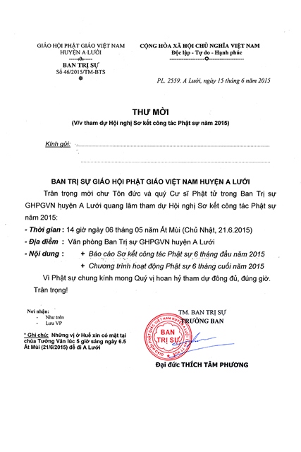 Thư mời tham dự Hội nghị Sơ kết công tác Phật sự năm 2015 tại huyện A Lưới