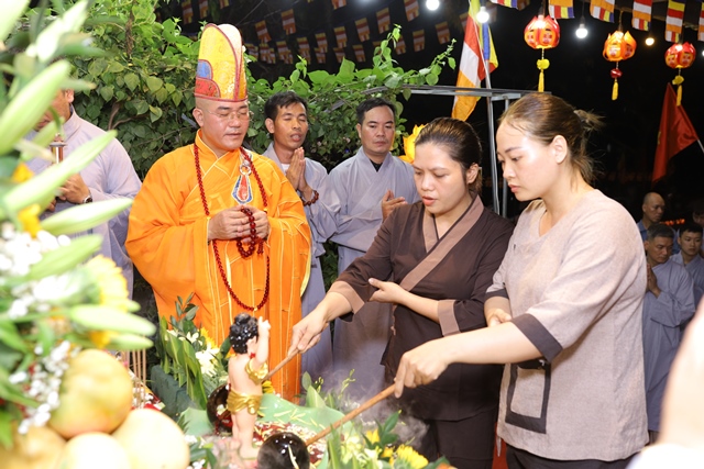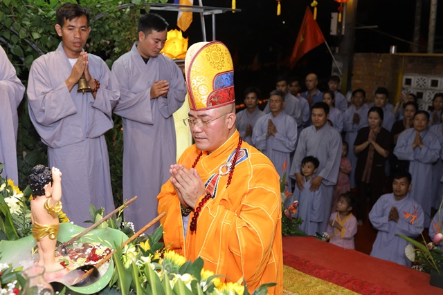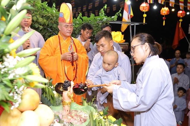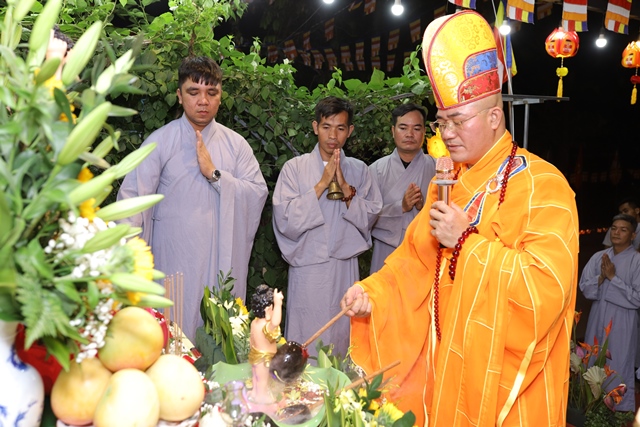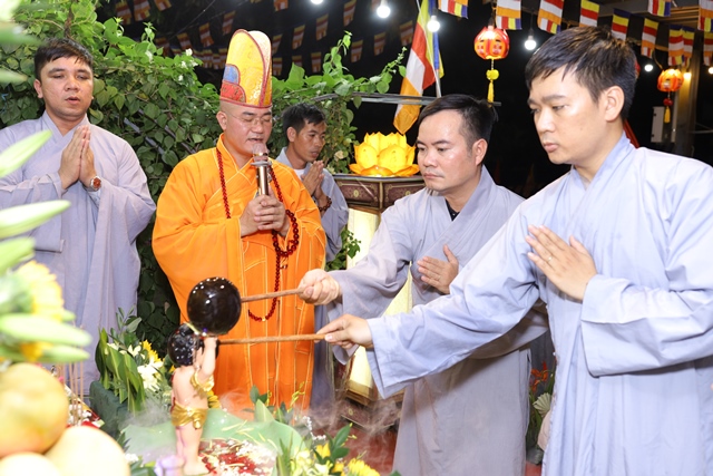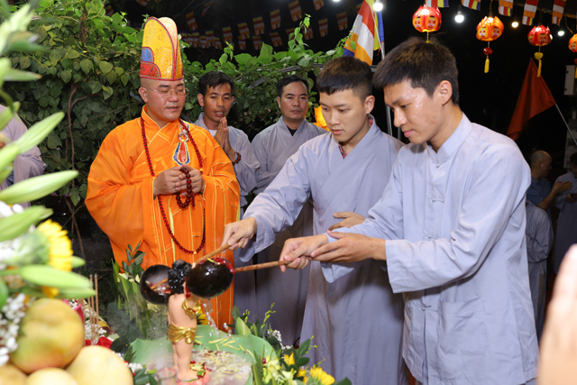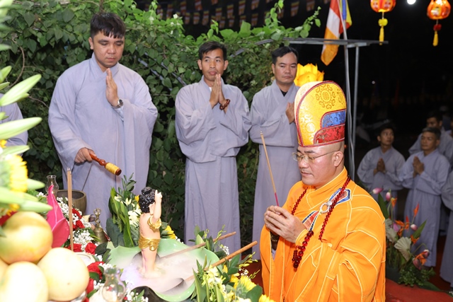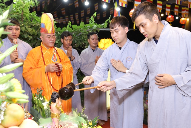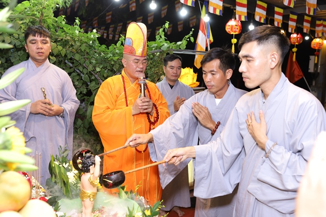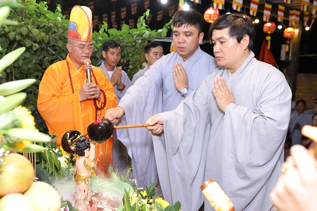 Trong lời ngân vang của bài kệ tắm Phật, Đại đức Thích Tâm Phương nâng gáo nước đầu tiên, thành kính thực hiện nghi thức tắm Phật. Nghi thức quan trọng này cũng được quý Phật tử lần lượt thực hiện ngay sau đó. Theo truyền thống Phật giáo Đại thừa, nghi thức tắm Phật có nhiều ý nghĩa, quan trọng nhất là tẩy tịnh não phiền, thanh lọc tâm.