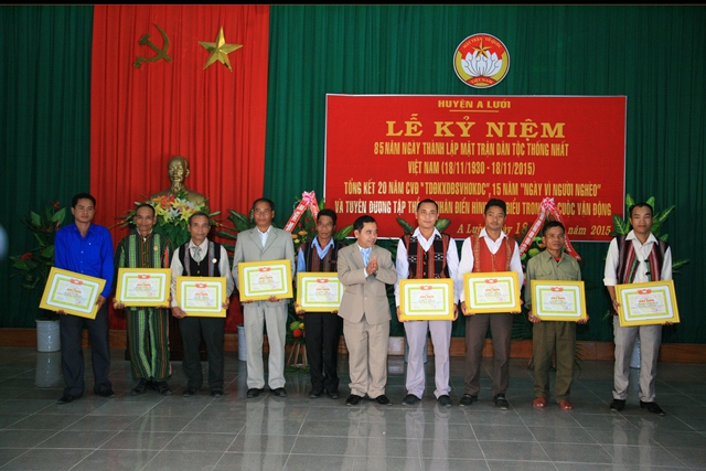 Ngày 18-11, tại Hội trường Huyện ủy, UBMTTQ Việt Nam huyện A Lưới tổ chức lễ kỷ niệm 85 năm ngày thành lập Mặt trận Dân tộc thống nhất Việt Nam (18-11-1930 - 18-11-2015); tổng kết 20 năm thực hiện Cuộc vận động (CVĐ) “Toàn dân đoàn kết xây dựng đời sống văn hóa ở khu dân cư” (1995 - 2015); 15 năm thực hiện CVĐ “Ngày vì người nghèo” (2000 - 2015)