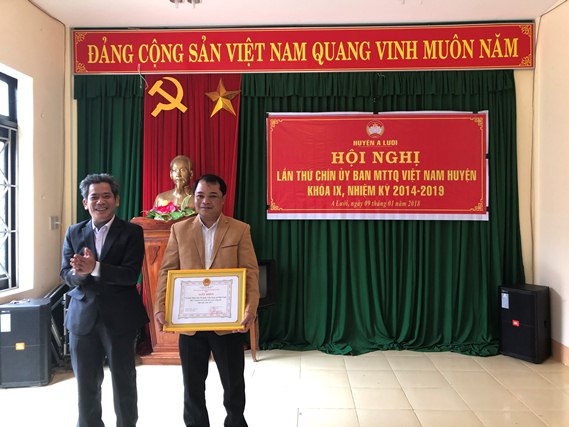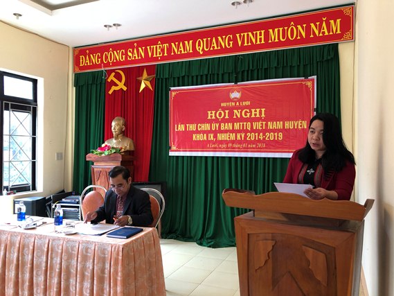 Ngày 9/01/2018, Ủy ban Mặt trận Tổ quốc Việt Nam huyện A Lưới tổ chức hội nghị lần thứ 9, khóa IX nhiệm kỳ 2014-2019 nhằm tổng kết, đánh giá kết quả công tác Mặt trận năm 2017 và triển khai nhiệm vụ trọng tâm năm 2018.