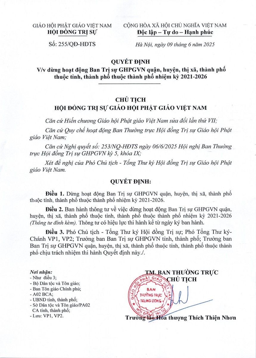 Theo đó, chính thức dừng hoạt động của các Ban Trị sự GHPGVN cấp quận, huyện, thị xã, thành phố thuộc tỉnh, thành phố trực thuộc Trung ương trong nhiệm kỳ 2021–2026; Ban hành Thông tư về việc dừng hoạt động Ban Trị sự GHPGVN quận, huyện, thị xã, thành phố thuộc tỉnh, thành phố thuộc Trung ương nhiệm kỳ 2021-2026. Thông tư có hiệu lực thi hành kể từ ngày ký ban hành.