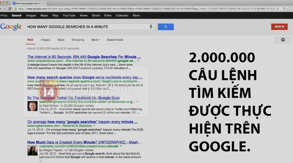 Là cỗ máy tìm kiếm lớn và phổ biến nhất hành tinh, cứ mỗi phút trôi qua Google lại đón nhận 2.000.000 lệnh tìm kiếm từ khắp nơi trên thế giới.
