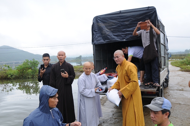 Sáng ngày 15-10, Ban Trị sự GHPGVN huyện A Lưới do Đại đức Trưởng Ban Trị sự Thích Tâm Phương; Đại đức Phó ban Thường trực Thích Tín Nhơn; Ni sư Phó Ban Trị sự - Trưởng Ban TTXH Thích Nữ Diệu Trung; Ni sư trú trì chùa Phước Sơn Thích Nữ Huệ An cùng quý Phật tử Gia đình Hương Sen tại Huế đã về thăm, động viên và trao 150 phần quà, mỗi phần quà trị giá 250.000đ đến bà con vùng lũ tại thôn Lê Thái Thiện và thôn Trung An, xã Lộc Trì, huyện Phú Lộc.