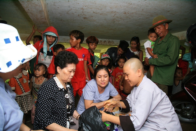 Có những cụ già, em nhỏ không thể mang nỗi quà nên được một số Phật tử hỗ trợ nhận giúp