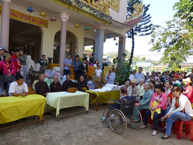 Thượng tọa trưởng phái đoàn đã có lời chia sẻ đến bà con nhận quà đồng thời cám ơn Chính quyền địa phương sở tại và Sư cô Trú trì tạo mọi điều kiên tốt để phái đoàn thực hiện Phật sự từ thiện. Ông Trịnh Văn Khá, Chủ Tịch UB Mặt trận Tổ quốc VN xã Cù Bị có lời cám ơn Thượng tọa cùng Phái đoàn đã nghĩ đến đồng bào tại địa phương để san sẻ những khó khăn của họ trong những ngày giáp Tết. Sau đó 300 phần quà được phái đoàn trao tận tay cho đồng bào nghèo trị giá mỗi phần quà bao gồm gạo, mí gói, bánh, mền, vải, áo, quần và phong bì gần 400.000 đồng . Sau khi phát quà xong, phái đoàn được Sư Cô Trú trì mời thọ trai.