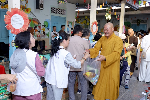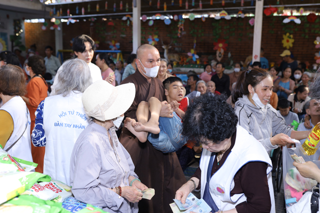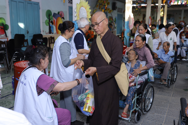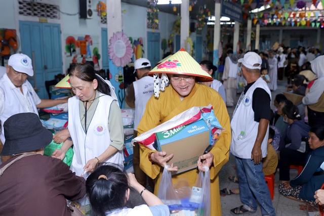 Tiếp theo đó, Thượng tọa Thích Minh Nhựt, Trưởng hội từ thiện "Bàn tay nhân ái" chia sẻ thêm đến quý Phật tử thành viên của Hội, dẫu biết rằng ngân quỹ của hội vẫn còn rất hạn hẹp, nhưng chúng tôi vẫn nỗ lực cố gắng thực hiện chương trình đầy ý nghĩa này. Chúng tôi đã đến từng nhà của những đối tượng mà hội đang bảo trợ nên cảm thông được sự thiếu thốn của họ. Họ là những mãnh đời bất hạnh, sống dưới những mái chòi tranh dột nát, thiếu thốn mọi bề. Thế nên những phần quà nhỏ bé của chúng ta sẽ là nhiên liệu tình thương xoa dịu phần nào khổ đau của mọi người. Tại đây, Hội từ thiện "Bàn tay nhân ái" đã trao tặng hơn 280 suất quà, mỗi suất quà trị giá hơn 1.500.000đ, gồm hiện kim, các nhu yếu phẩm, 20 học bỗng cho các em học sinh nghèo hiếu học và 30 chiếc xe lăn cho người khuyết tật, tổng trị giá hơn 500 triệu đồng.