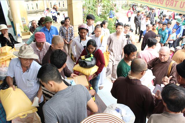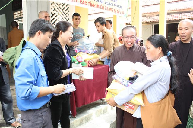 Trước khi tặng quà, Thượng tọa Thích Thiện Hương, Trưởng Ban Kiểm soát GHPGVN tỉnh Đồng Tháp, Cô Trịnh Thị Minh, Giám đốc Trung tâm An Đông Plaza đã chia sẻ với bà con nơi đây về tấm lòng của chư Tôn đức Tăng Ni, quý phật tử dù ở xa xôi nhưng bằng tinh thần lá lành đùm lá rách đã mang từng món quà tới bà con bị gánh chịu hậu quả nặng nề do 2 cơn siêu bão số 10 và 11 đã đổ bộ vào miền Trung trong những ngày qua.
