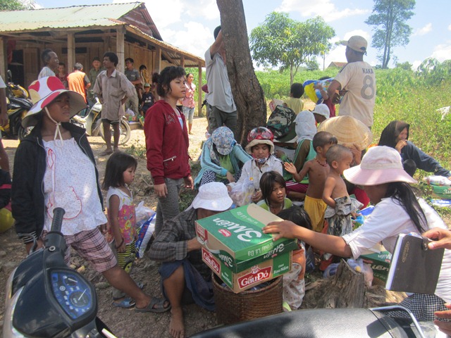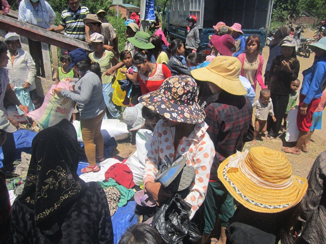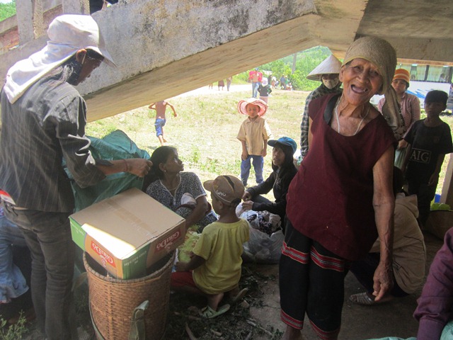 Bà con nhận áo quần từ phái đoàn quyên góp
