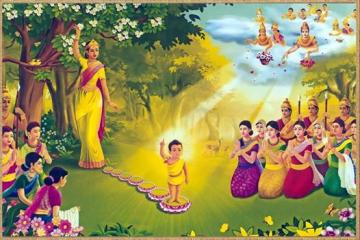 Sự Ðản sinh của đức Phật ngang qua bảy bước mà Kinh Thái Tử Thụy Ứng Bản Khởi, kinh Ưu Bà Di Tịnh Hạnh Diệu Pháp môn phẩm Thụy Ứng ghi lại như sau: Sau khi thọ thai Ðấng Thánh lớn, gần ngày mãn nguyệt khai hoa, Hoàng hậu Ma Gia trở về quê mẹ. Trên đường về quê cũ, Hoàng hậu nghỉ chân dưới một vườn hoa Lâm Tỳ Ni xinh đẹp. Hoàng hậu khoan thai dạo bước quanh vườn, hít thở không khí trong lành của gió xuân mát dịu, lắng nghe từng đàn chim chuốt giọng trên cành, ngắm nhìn từng đóa hoa đua sắc khoe màu trong nắng sớm, rồi nhẹ tay vin hái cành hoa Vô Ưu thì liền Ðản sinh Ðấng Thánh lớn. Sự Ðản sinh ấy được đánh dấu qua tiến trình giải thoát giác ngộ, biểu trưng qua bảy bước nở hoa sen, mà nhân loại hôm nay đang ngưỡng vọng và noi theo Ngài.