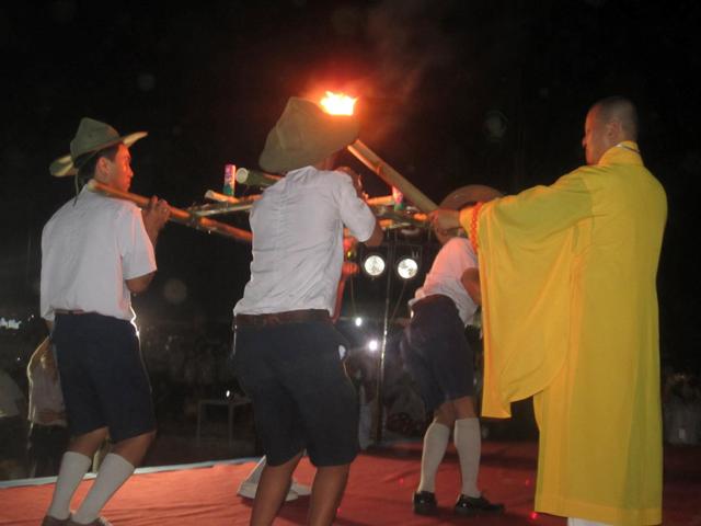 Đại đức Trưởng Ban Tổ chức châm đuốc khai mạc đêm văn nghệ trại Dũng