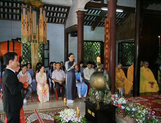 Huynh trưởng cấp Tấn: Tâm Ngọc – Nguyễn Thị Minh Nguyệt, Phó Trưởng Phân Ban GĐPT tỉnh Thừa Thiên Huế, Liên Đoàn phó GĐPT Ba La Mật thay mặt Ban Huynh trưởng phát biểu tại buổi lễ: “Hôm nay trong niềm hoan hỷ trong mùa an cư Kiết hạ của chư Tăng, ngày đại hỷ được sự nhất trí của hai gia đình cha mẹ đã xin phép Thượng tọa cử hành Lễ Hằng thuận tại ngôi chánh điện Tổ đình Ba La Mật để cầu mong đức Phật, chư vị Bồ Tát, chư vị Thánh Tăng gia hộ độ trì cho cuộc sống hạnh phúc gia đình của hai Huynh trưởng được trăm năm đầu bạc răng long. Hai Huynh trưởng đã gắn bó cùng đơn vị GĐPT Ba La Mật hơn 15 năm qua, từ một chú chim non Oanh vũ nam, nữ đến nay đã là Huynh trưởng cấp Tập….. niềm vui lớn của tổ chức GĐPT nói chung và GĐPT Ba La Mật nói riêng, chị cầu chúc hai em luôn an lạc, thành đạt mọi sở nguyện”.