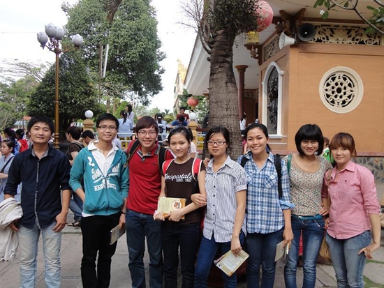 Minh Thông ( áo đỏ) cùng bạn bè trong một khóa tu sinh viên tại chùa Hoằng Pháp