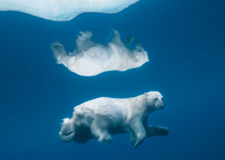 Một con gấu bắc cực bơi dưới làn nước trong xanh tại Nunavut, Canada