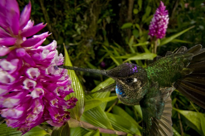 Một chú chim đang hút mật hoa ở Cerro Punta, Panama.