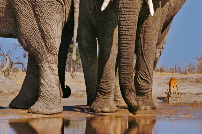 Sự tương phản giữa hình dáng khổng lồ của những con voi với chú linh dương Impala khi chúng cùng uống nước ở hồ.